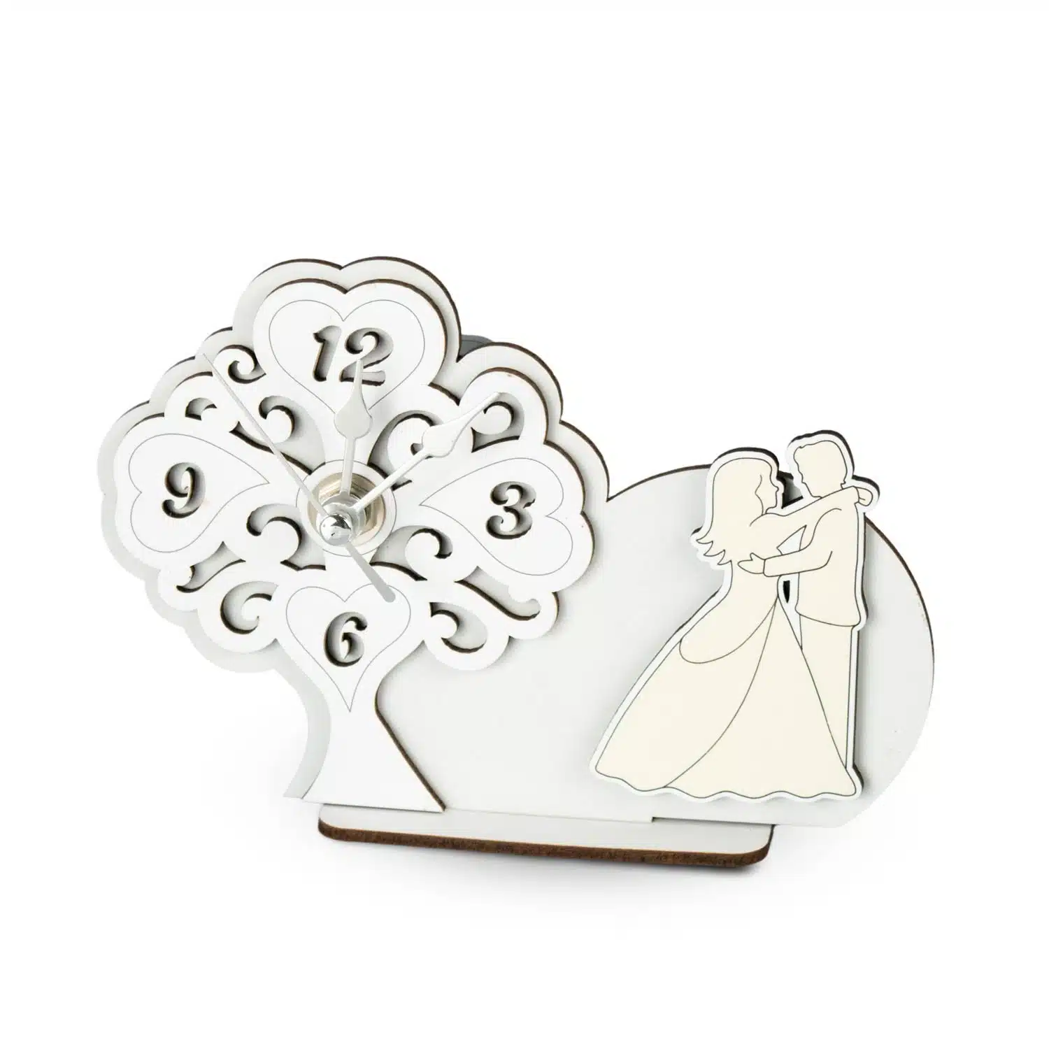 L’orologio da tavolo (da appoggio) realizzato in legno nelle tonalità del bianco in multistrato con applicazione a rilievo cuore, è un dono elegante e utile per festeggiare la cerimonia, omaggia con più carattere l’ambiente che lo accoglie grazie al design, ai colori neutri e al significato del tema rappresentato.