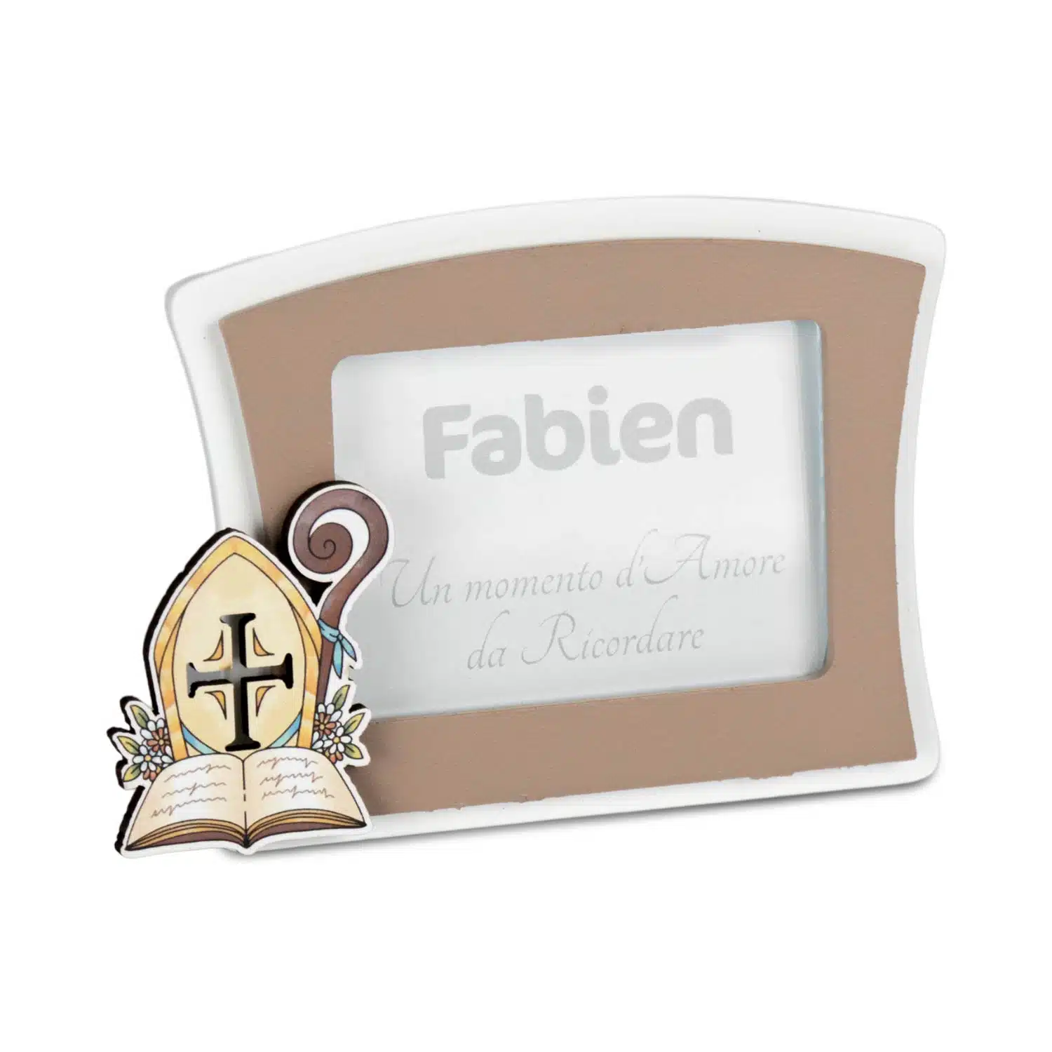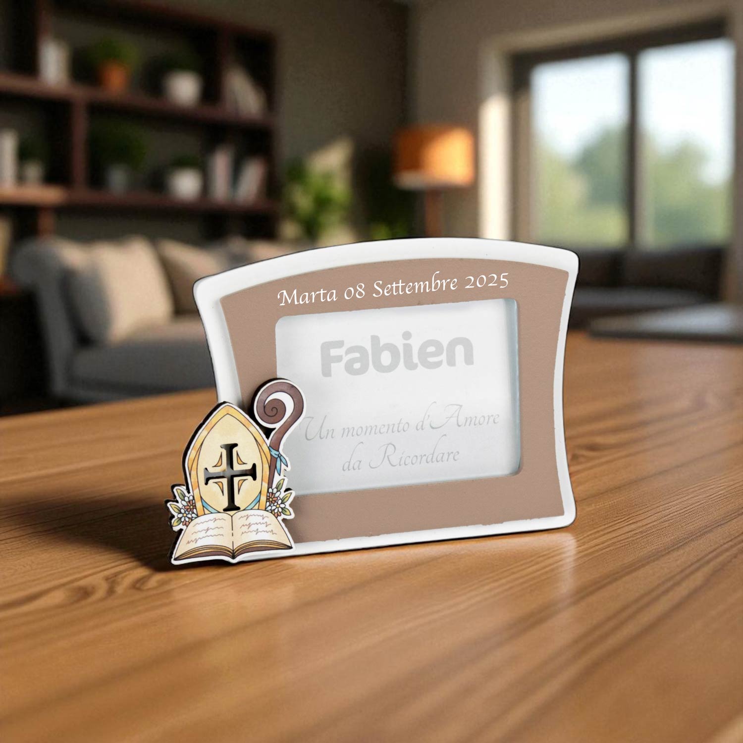 Bomboniera Mini Portafoto Cresima in Legno tortora con Applicazioni Cappello Vescovo Cresima