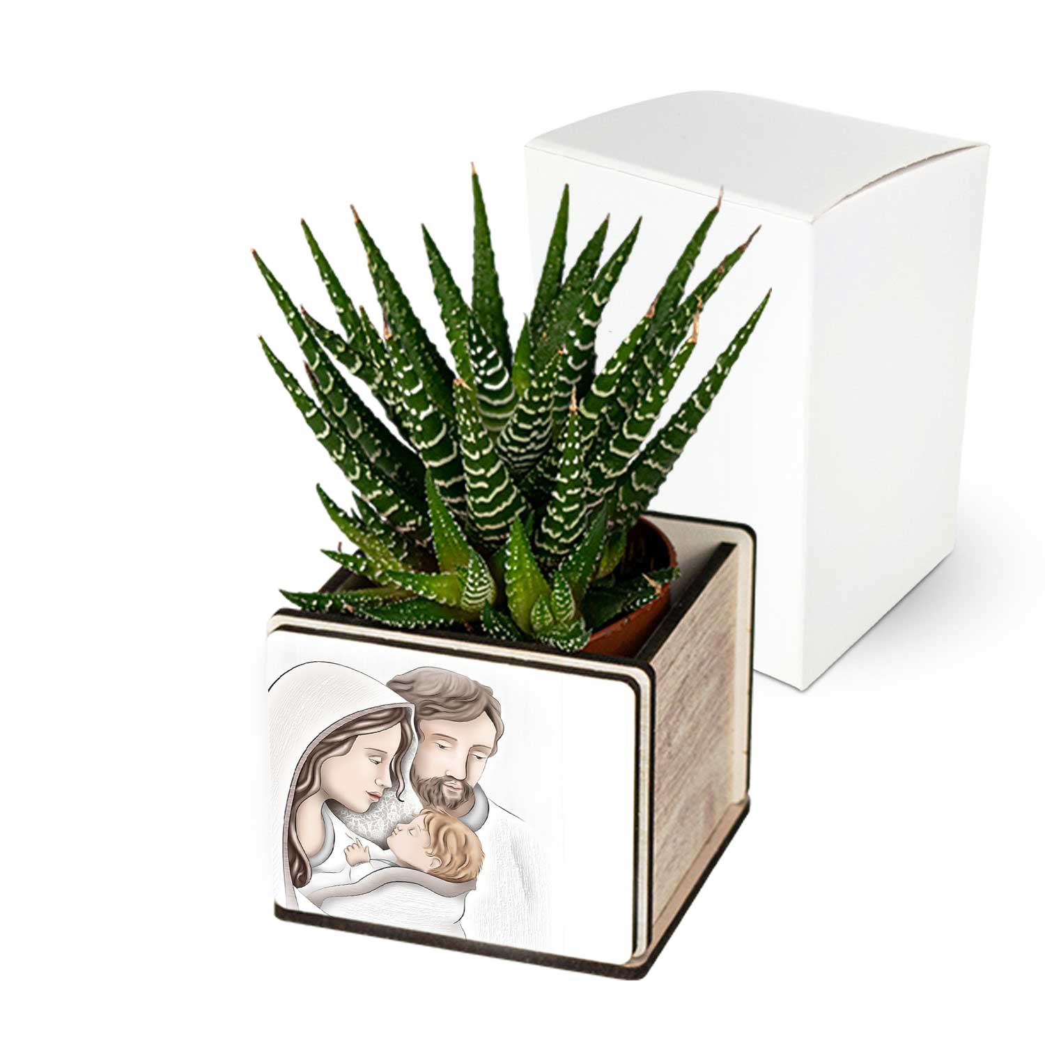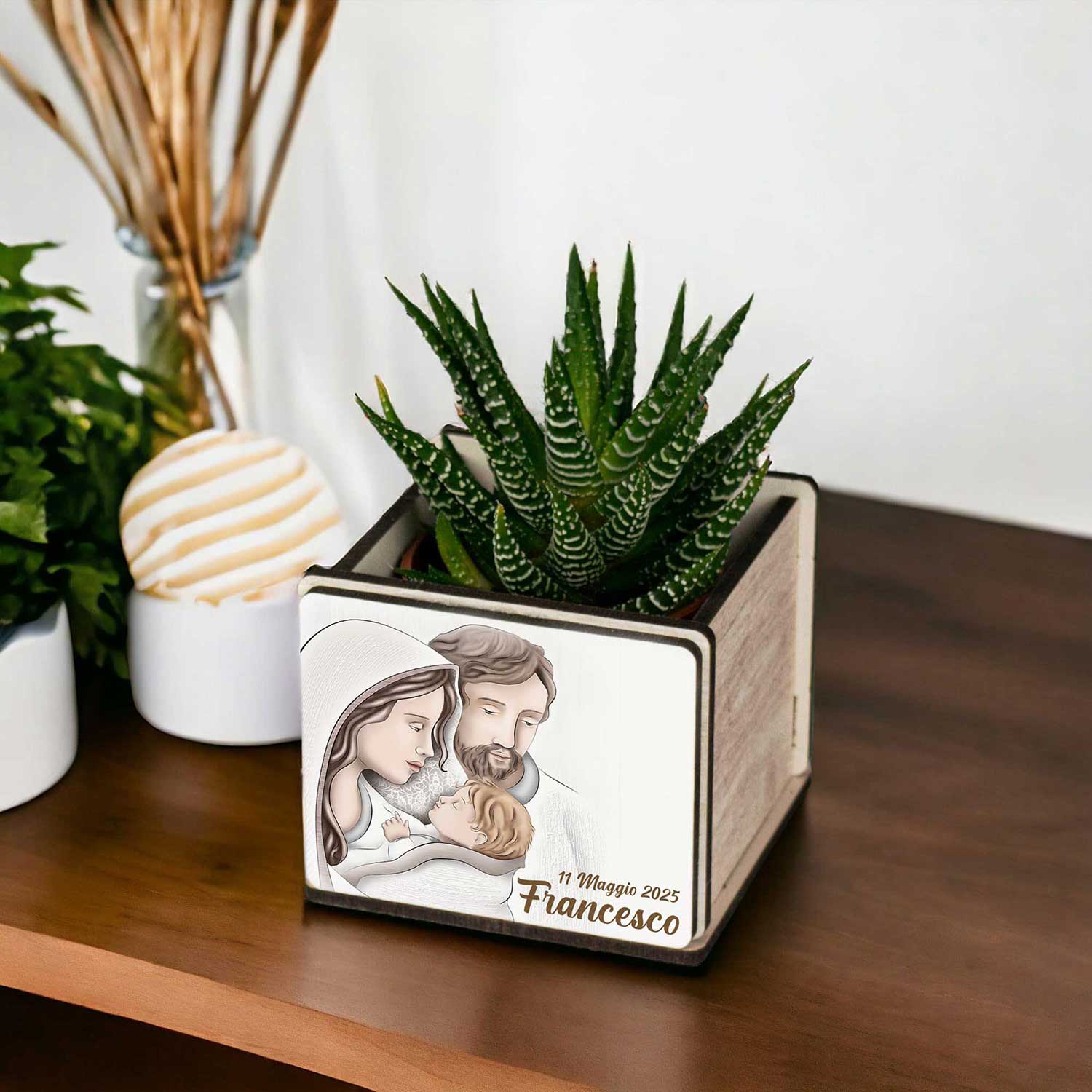 Questa bomboniera con piantina grassa e icona della Sacra Famiglia è pensata per chi desidera celebrare con significato e stile una cerimonia religiosa come Battesimo, Comunione, Cresima o Matrimonio. Il design moderno del vasetto in legno bianco, impreziosito dall’immagine della Sacra Famiglia, ospita una vera piantina grassa, simbolo di vita, radici e protezione. Ogni bomboniera è personalizzabile con il nome del festeggiato e la data della cerimonia, rendendo ogni pezzo unico e profondamente legato al ricordo dell’evento. La scatola regalo inclusa valorizza la presentazione, rendendola ideale anche come regalo religioso personalizzato. Il suo stile sobrio la rende perfetta sia per bimbi che per bimbe e si adatta a qualsiasi contesto: classico, moderno, spirituale o green. Prodotta in Italia con materiali naturali e attenzione artigianale, questa bomboniera Sacra Famiglia Made in Italy è un dono autentico che emoziona e resta nel tempo.