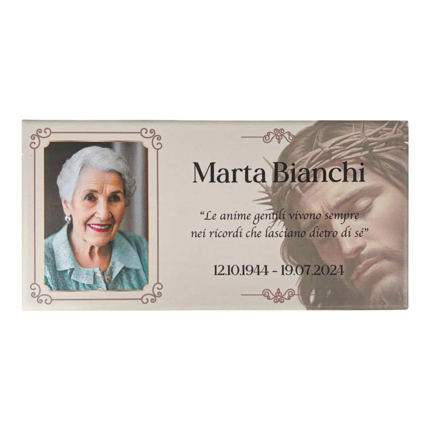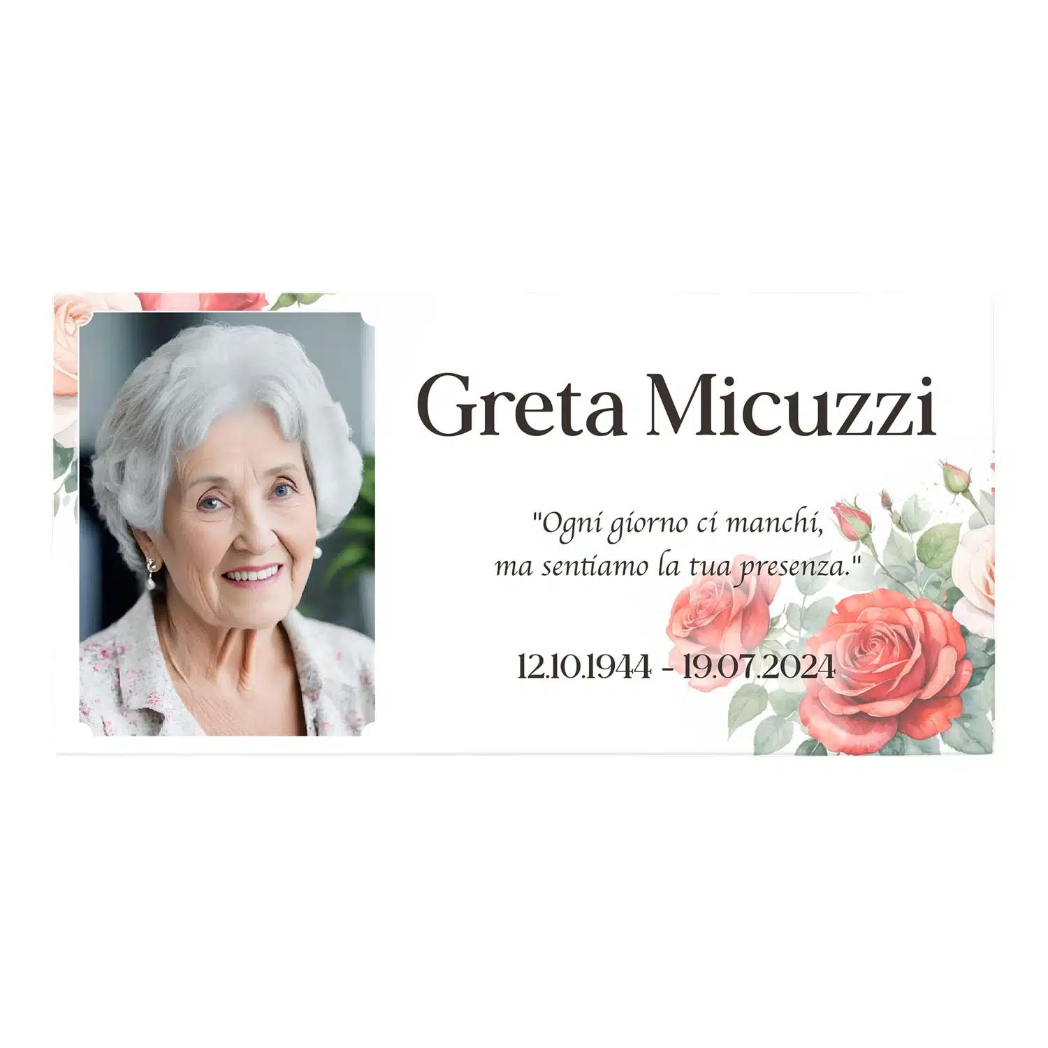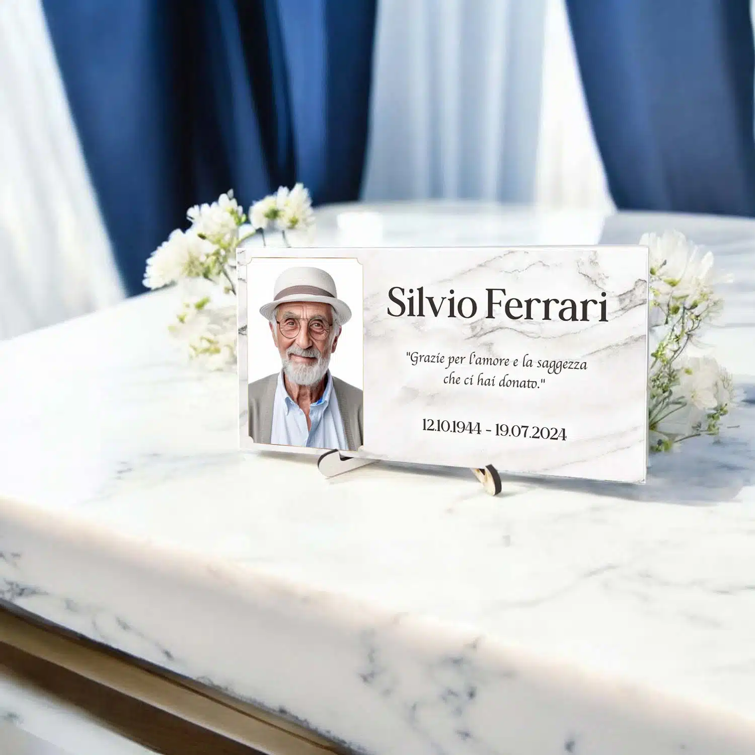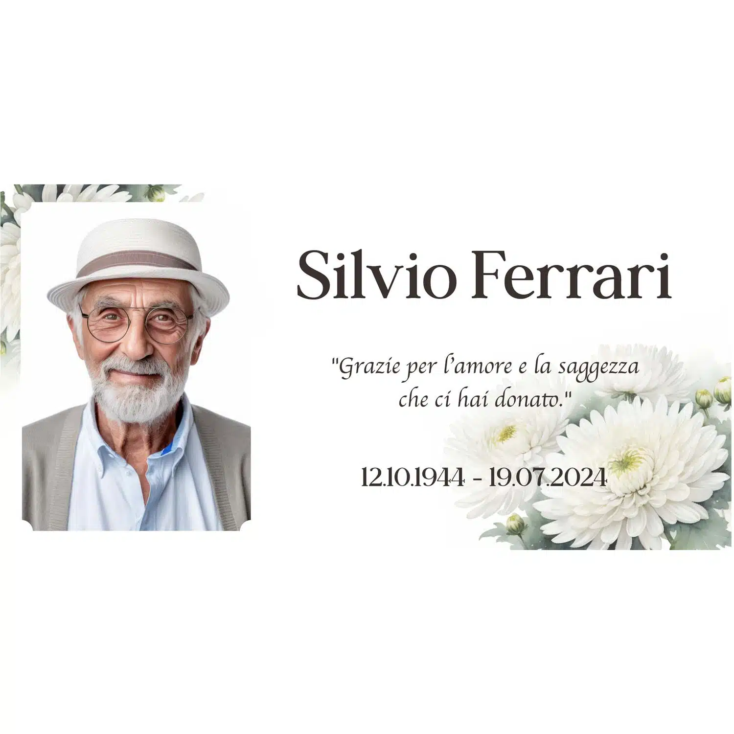 Targa commemorativa elegante e durevole realizzata in gres porcellanato di alta qualità, perfetta per lapidi, cimiteri o ambienti interni. Personalizzabile con foto, nome, date e una dedica personale a tema crisantemi.